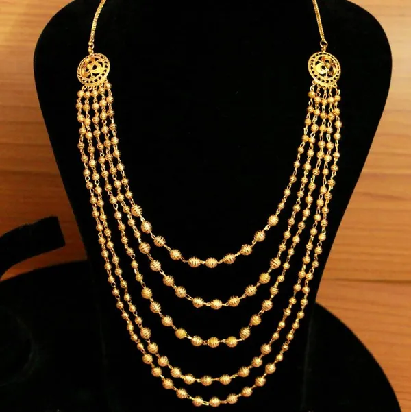 This necklace is handcrafted in brass alloy with imitation gold beads work of very fine quality , this necklace is coated with 18kt nickle free gold plating to avoid skin allergies and its very light in weight .