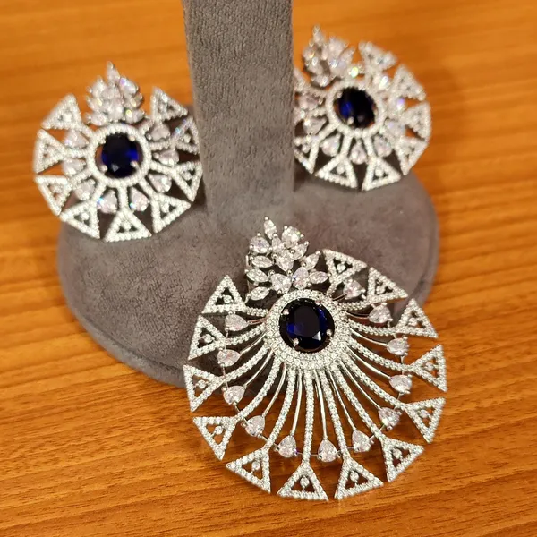 Blue Sapphire Look Cz Studded Silver Plated Pendant Set