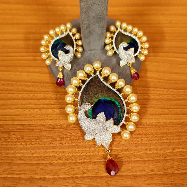 Celebrate timeless Indian elegance with the MorNeel Peacock Pearl Pendant Set from Sanvi Jewels. Inspired by the regal beauty of a peacock feather, this exquisite pendant set features a rich peacock-blue feather motif framed with lustrous pearls and accented by a sparkling diamond-look peacock design.