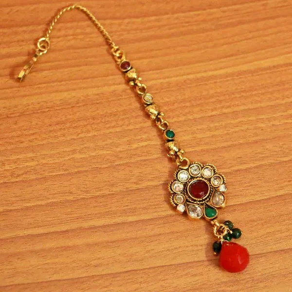 This polki studded maang tikka is handcrafted in copper alloy with imitation ruby colour stone & polki stone of very fine quality . This maang tikka is coated with gold rhodium plating as done on the real jewellery . The design itself looks very real and is perfect for wedding wear.Â